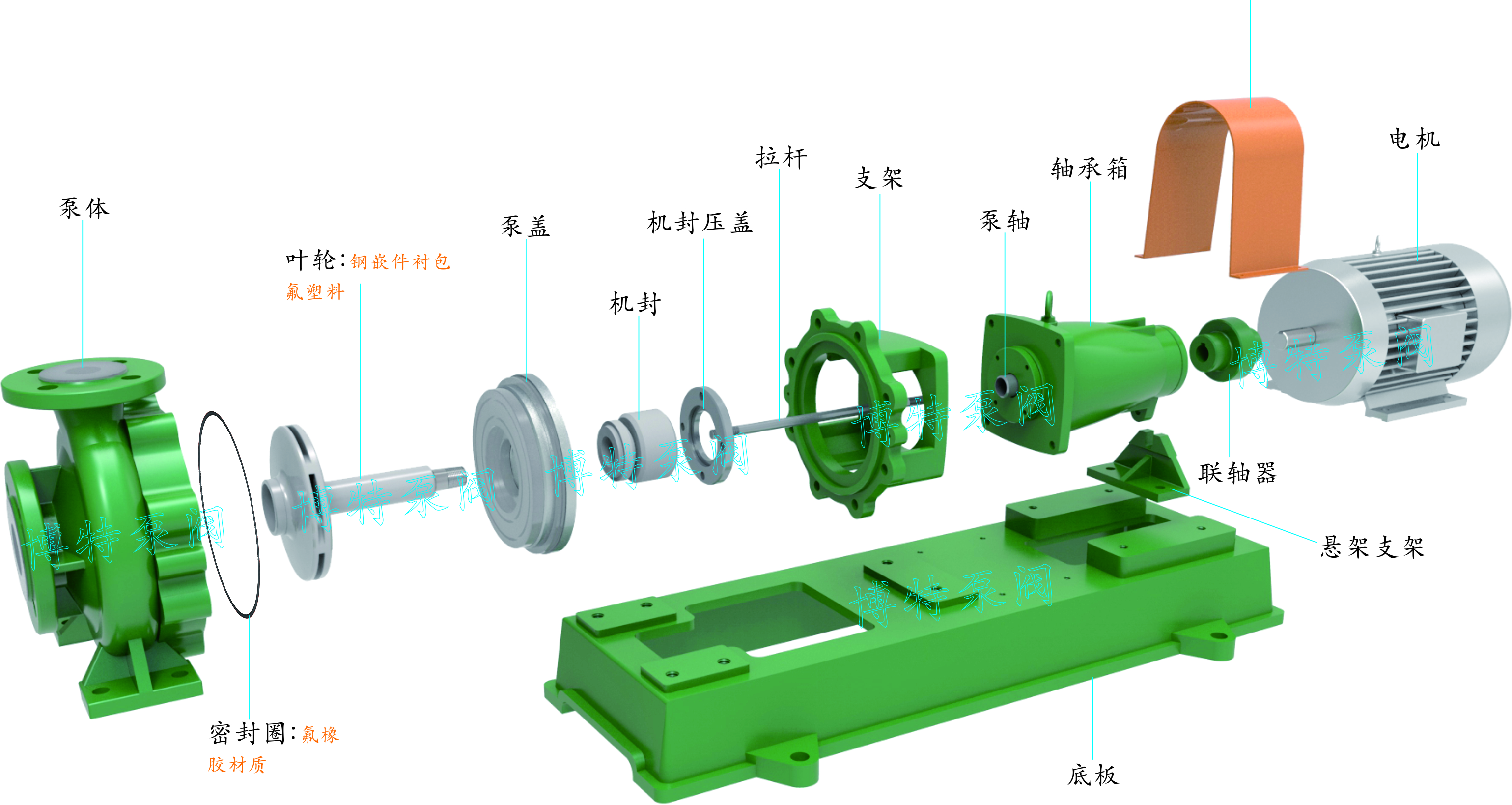 單級(jí)單吸懸臂式離心泵,過流部件采用純凈的氟塑料合金制成,無雜質(zhì)析出,十分適用于輸送高純度的化學(xué)介質(zhì)。泵的承重部分為金屬材料。配置外裝式波紋管機(jī)械密封,對(duì)磨材質(zhì):氧化鋁VS四氟、碳化硅VS四氟、硬質(zhì)合金VS硬質(zhì)合金,用戶可按要求自行選擇對(duì)磨付。